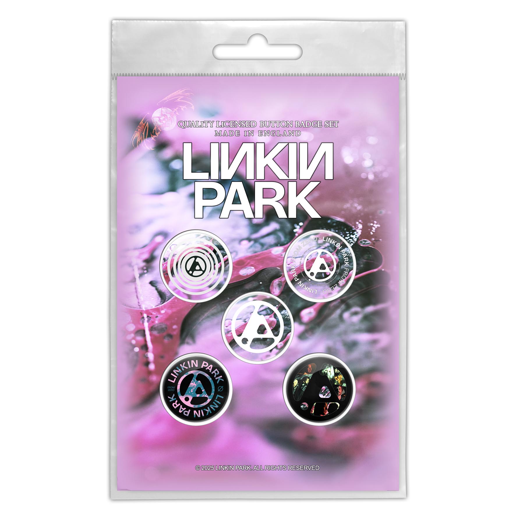 Five button badges measuring 25mm each